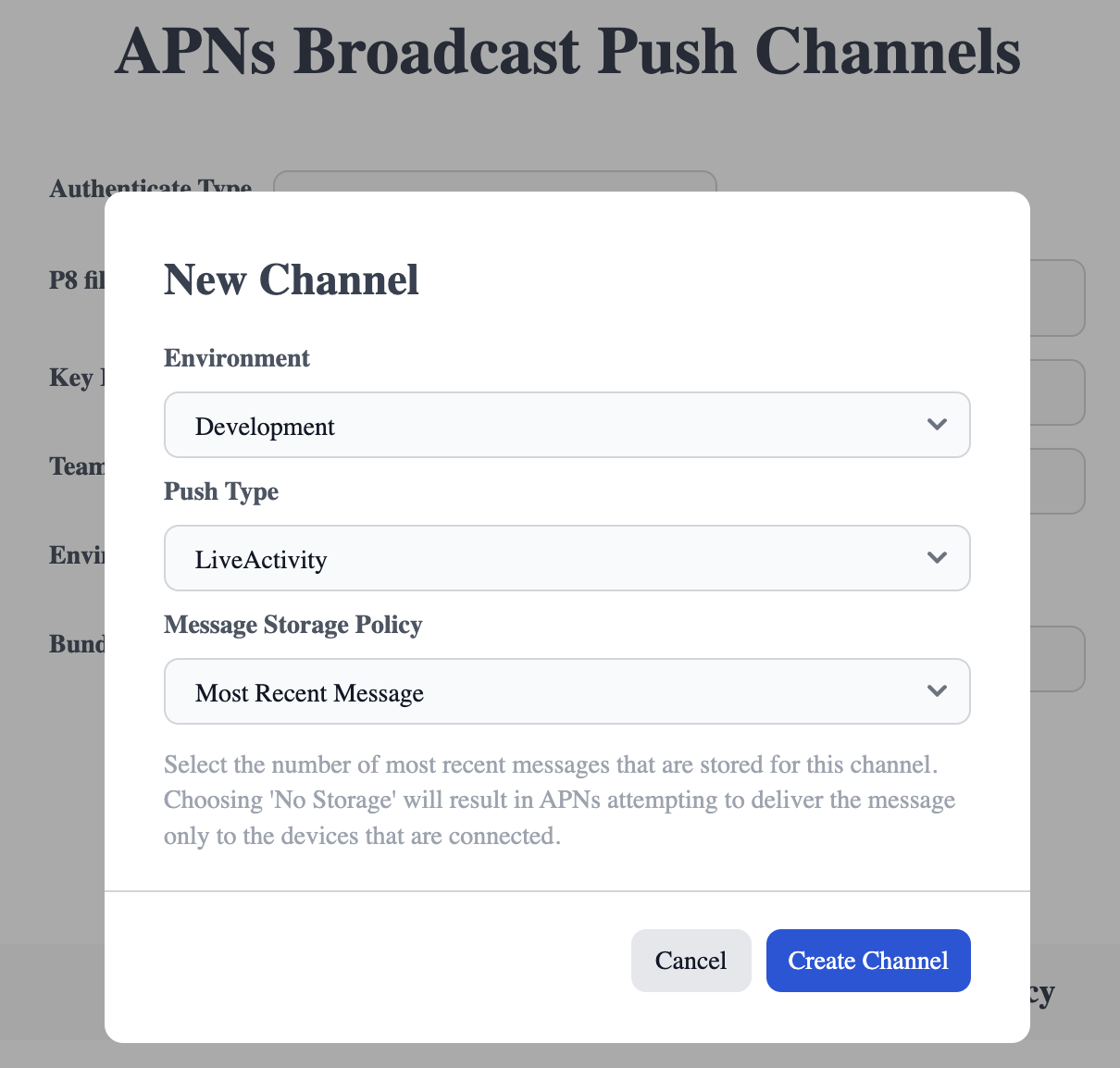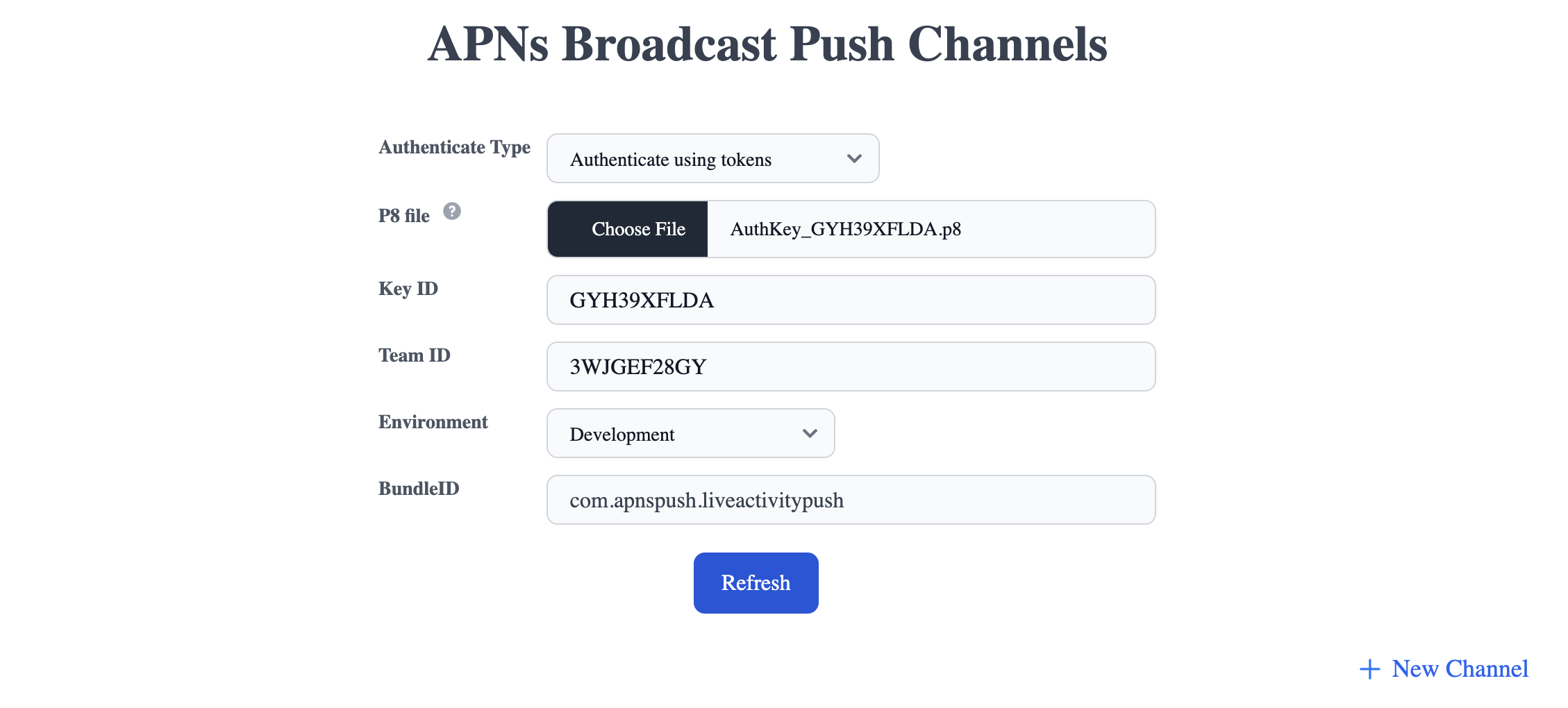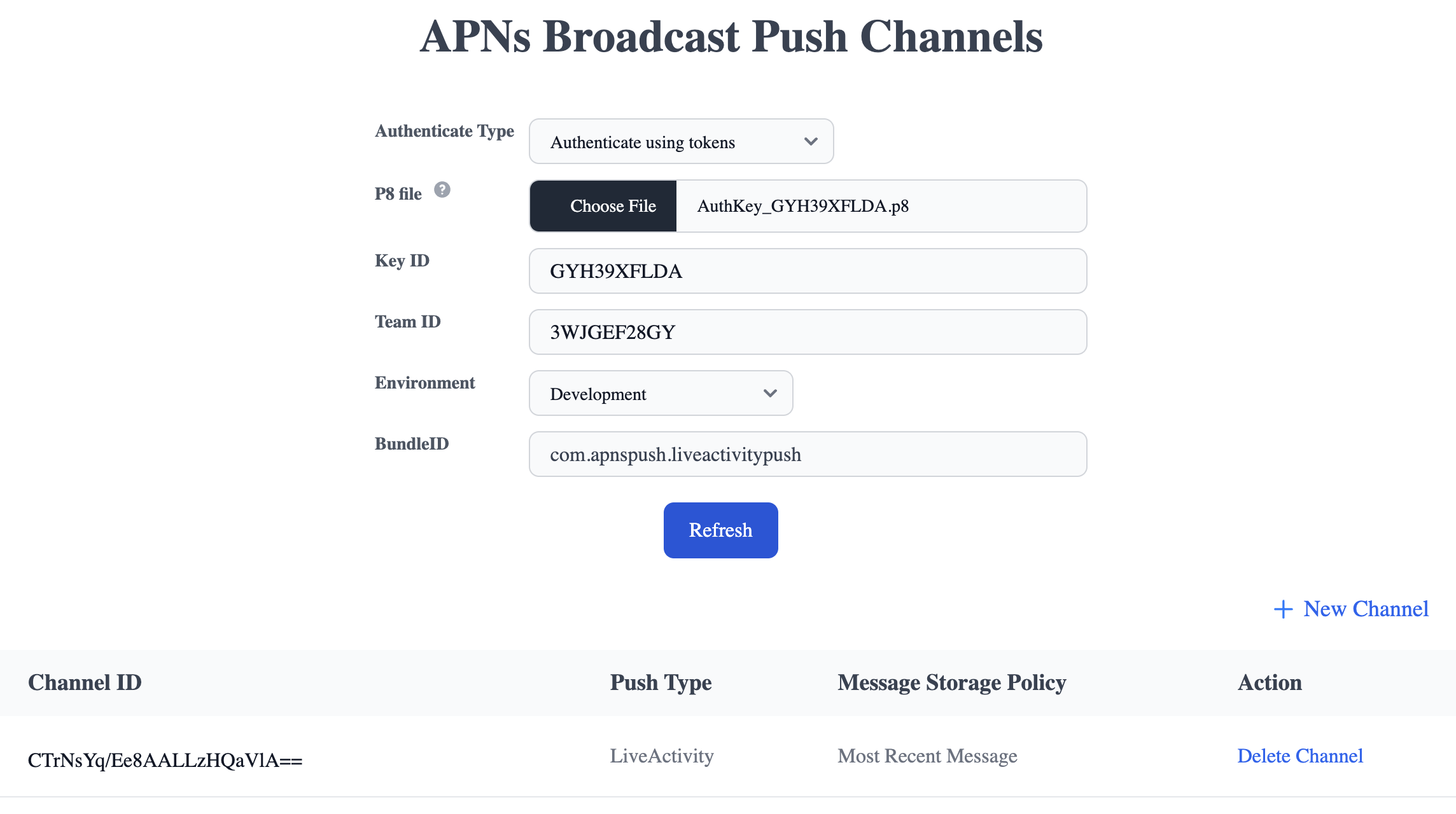 Bundle ID, excluding the ".push-type.liveactivity" suffix. - Click the "+ New Channel" button.